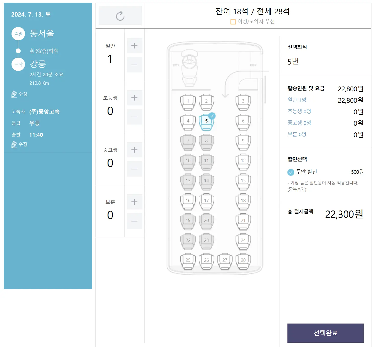 이용하실 버스를 선택하셨다면 해당버스의 남은 좌석을 확인하고 원하는 자리를 선택합니다. 최종 결제 금액을 확인하고 선택 완료를 누른 후 결제하기를 진행합니다.