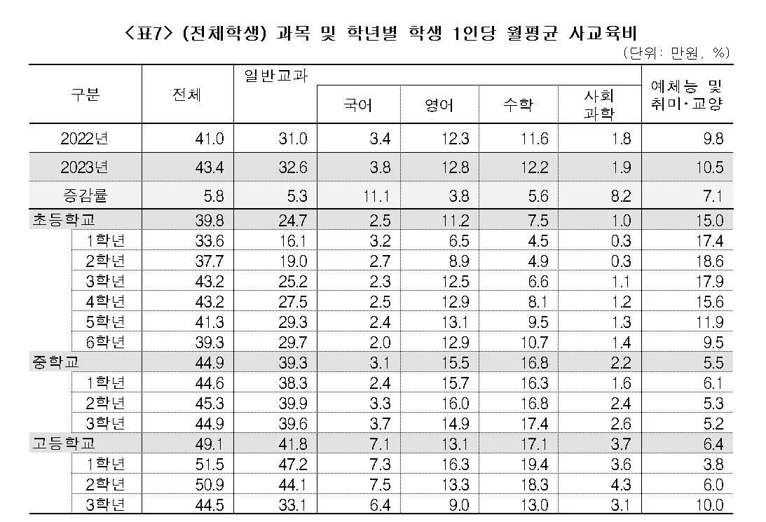 일반적으로는 아이의 학년이 올라갈수록 대비해야 하는 과목이 늘어나다 보니 교육비가 더 많이 들어가게 되고 중학교 고등학교로 올라갈수록 학원비도 더 비싸집니다.