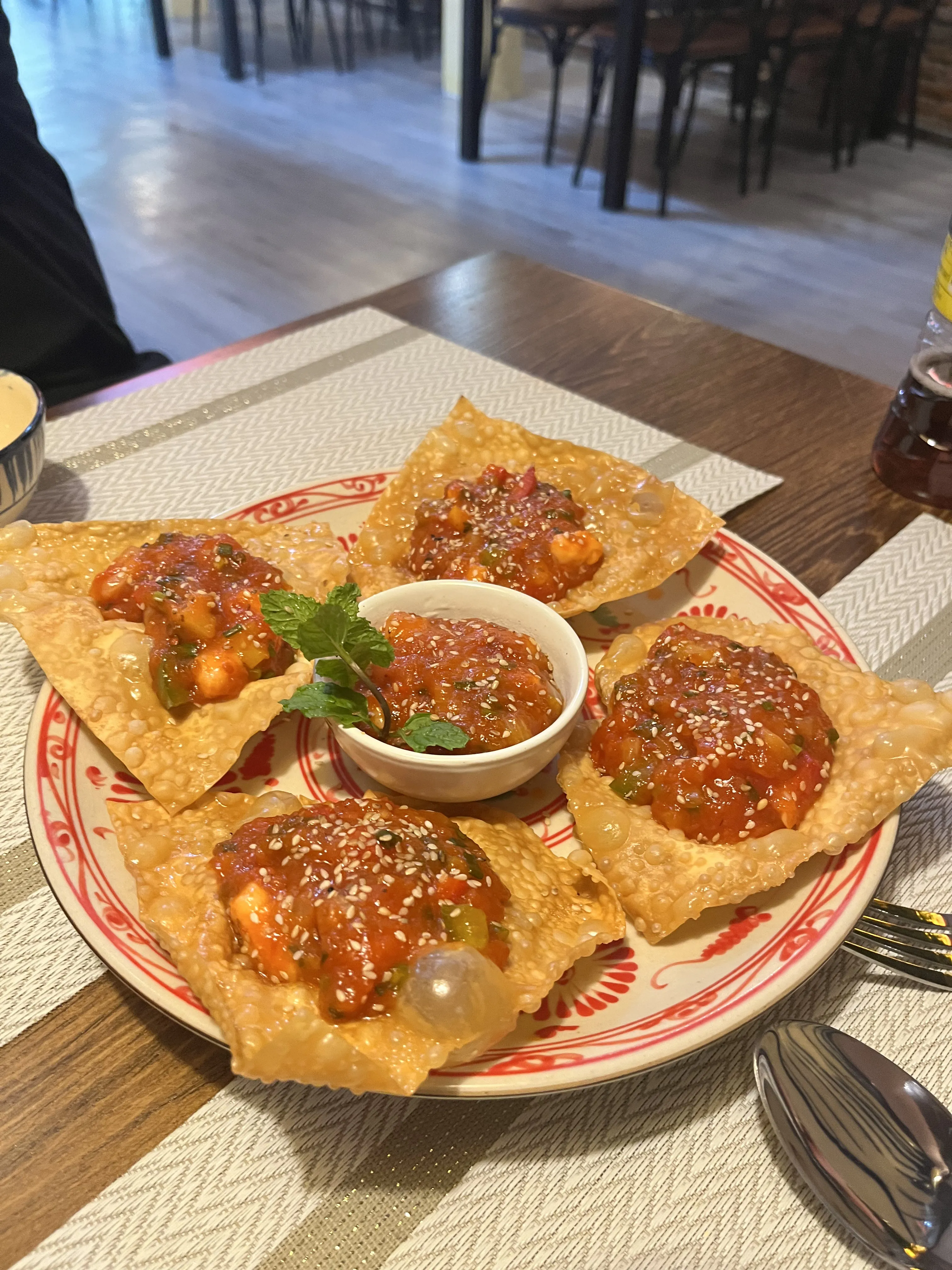 프라이드완탕은 얇은 만두피를 바삭하게 튀겨 그릇처럼 사용되더라고요. 그 위에 해산물등의 다양한 속을 넣어 아주 새콤하고 달짝지근한 소스를 듬뿍 버무리는 것 같았는데요!