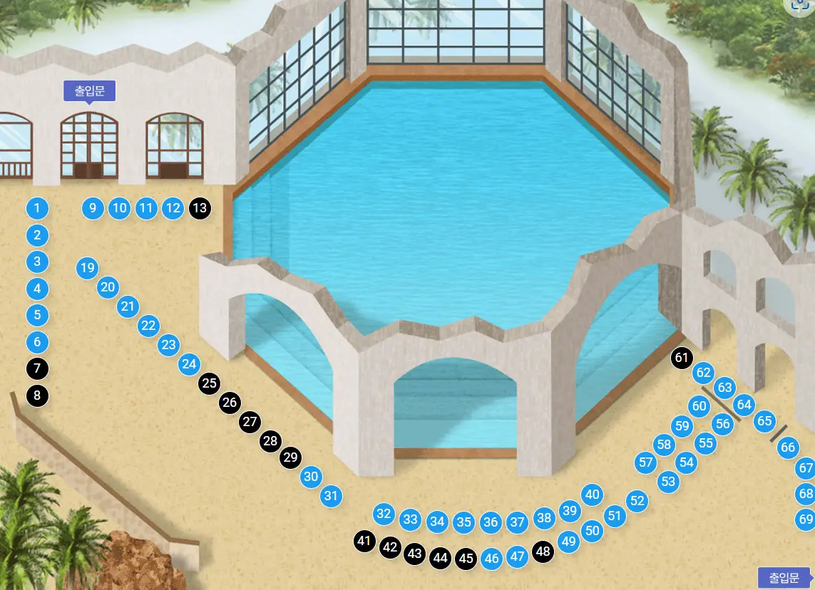 실내파도풀장도 가까워서 두루두루 돌아다니기 적당한 동선입니다. 추천하는 자리는 공간이 여유 있는 36번입니다.