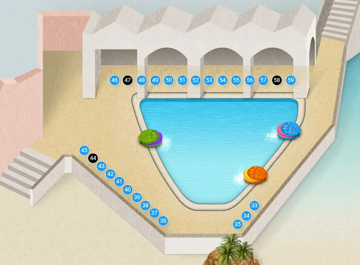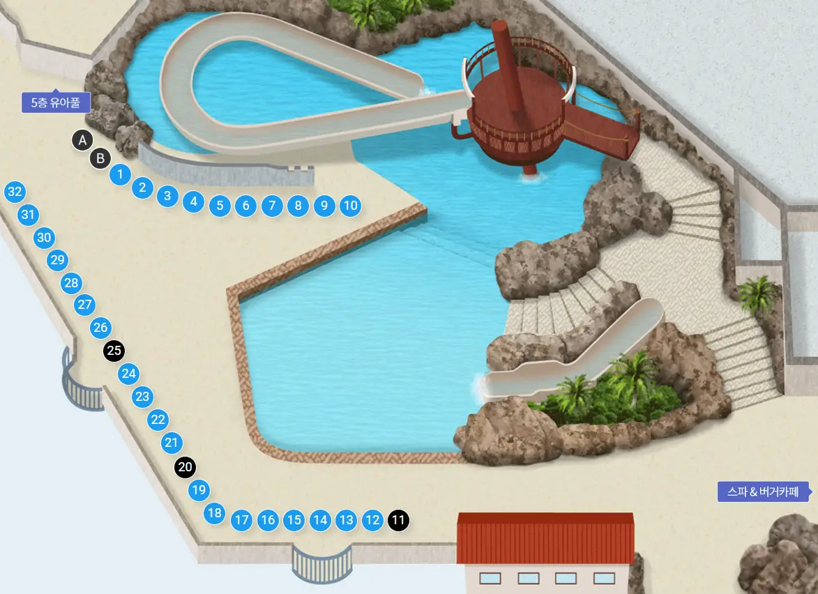 실내파도풀장도 가까워서 두루두루 돌아다니기 적당한 동선입니다. 추천하는 자리는 공간이 여유 있는 36번입니다.