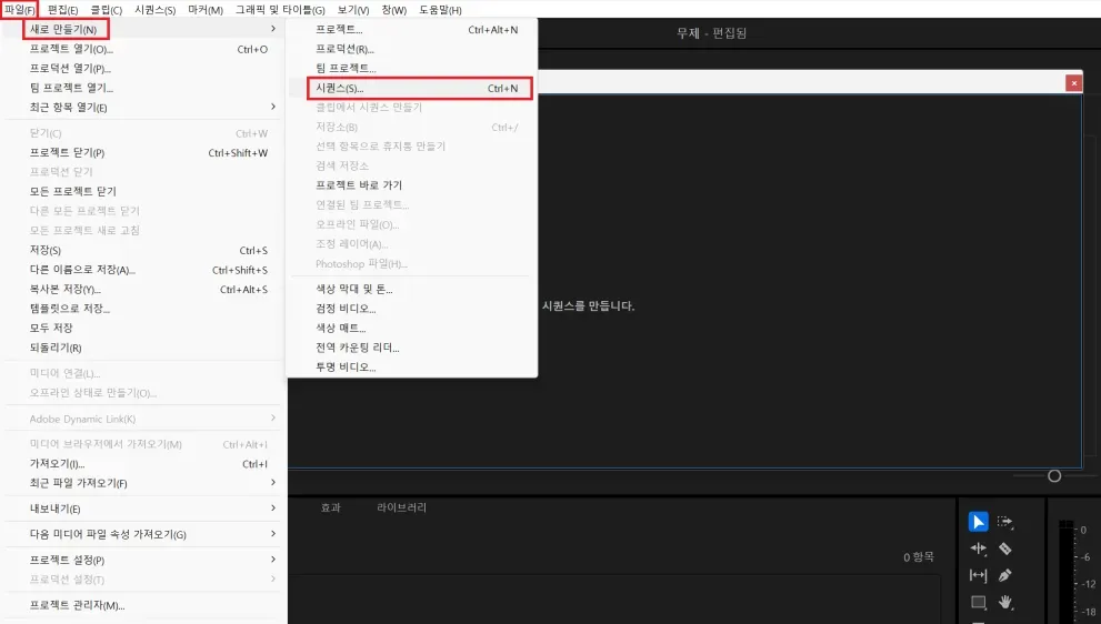 상단 왼쪽 파일에서 새로 만들기 그리고 시퀀스를 선택해요. 이렇게 해도 되지만 단축키 컨트롤+N을 누르셔도 바로 시퀀스 만들기 창이 열린답니다.