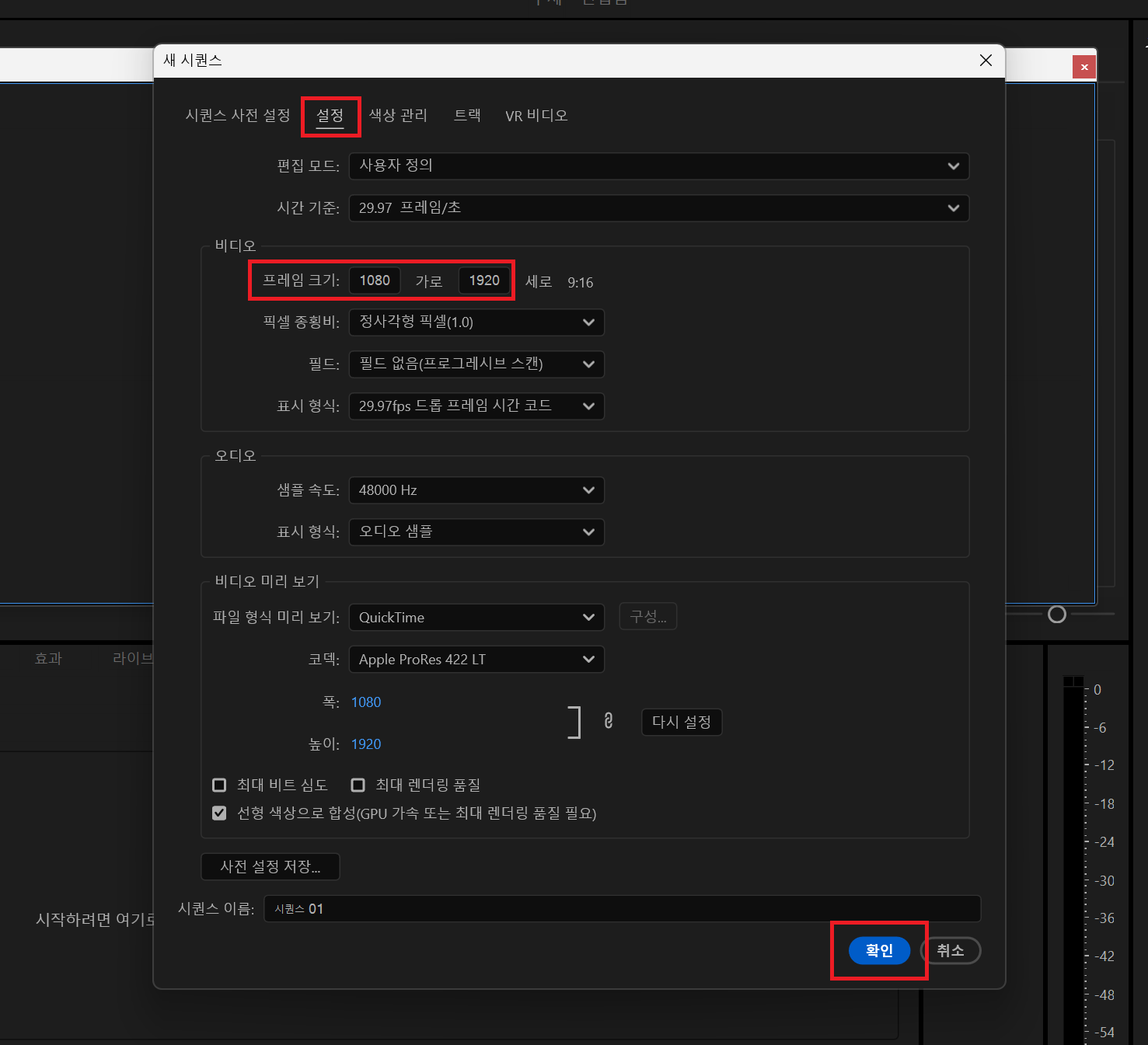 그다음 아래의 캡처 사진처럼 바로 옆에칸 설정을 눌러 프레임 크기를 가로 1080 세로 1920으로 적어주고 확인을 눌러주시면 쇼츠용 시퀀스 만들기 완성!!