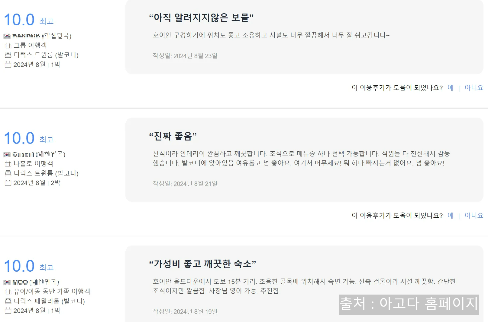 만족스러운 숙소를 정하는 기준은 개인마다 다르지만 호이안의서의 1박 숙소를 저와 같은 기준으로 알아보고 계신다면 도움이 되실 거예요!